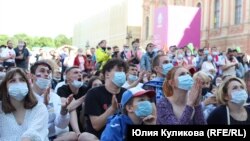 Многие из пришедших посмотреть футбол в фанзоне были без защитных масок или "носили" их на подбородке, хотя о коронавирусе и масках постоянно говорили волонтеры через громкоговорители.