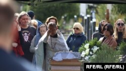 В церкви на кладбище идет отпевание. Часть пришедших людей стоит на улице, остальные - внутри. Журналистов в церковь не пускают.