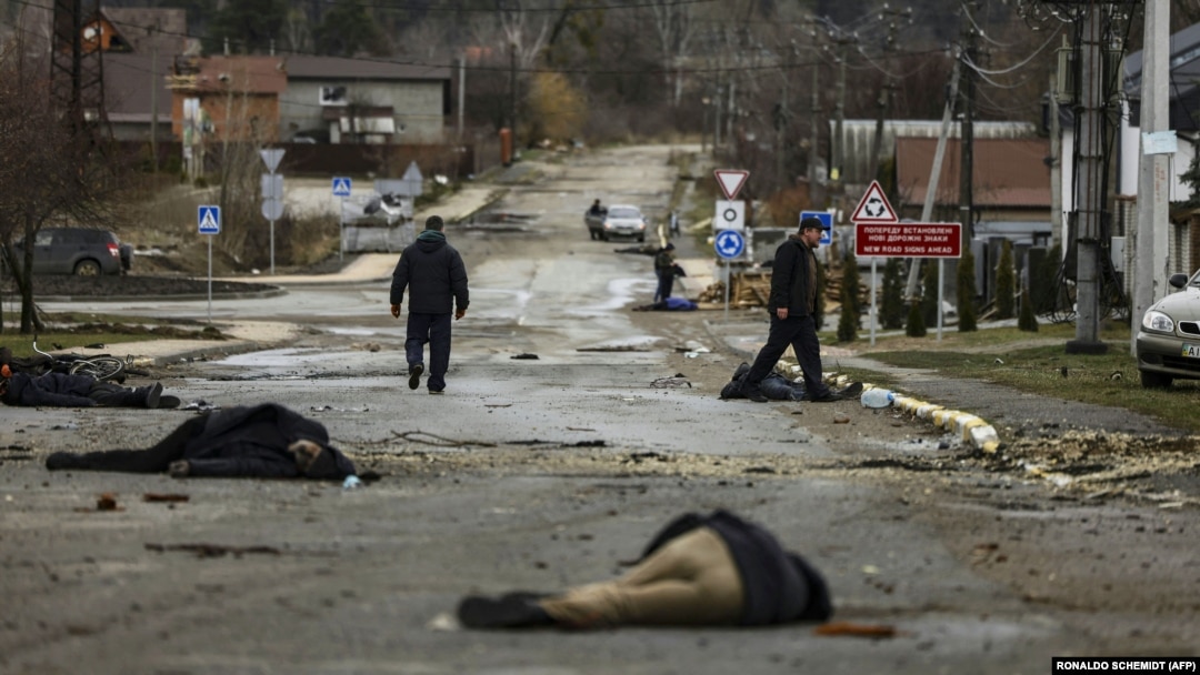 Вечером 2 апреля журналисты Reuters опубликовали шокирующие фотографии с улиц Бучи. На них видны тела убитых в гражданской одежде, которыми усеяны улицы, – 16 из 20 тел, как показал фотограф France Press, лежали на тротуаре или около бордюра, три тела – посередине дороги, еще одно – во дворе разрушенного дома. У некоторых из них были завязаны глаза и руки за спиной, многие убиты выстрелами в затылок. Сам город практически разрушен, на фото сожженные машины и поврежденные снарядами и ракетами дома.